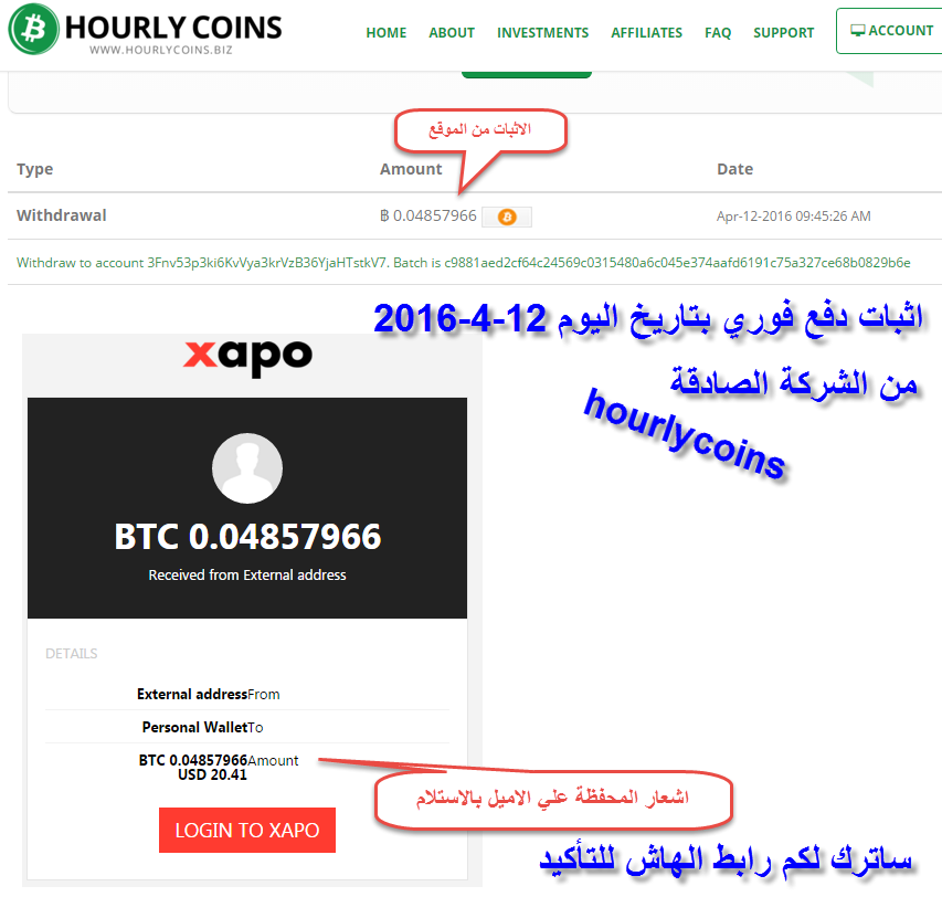 رد: شرح افضل شركة hourlycoins لتعدين البيتكوين والاستثمار مع اثبات الدفع بدون حد ادني للسحب . . اثبات دفع فوري بتاريخ اليوم 10/4/2016 من افضل الشركات الصادقة شركة HourlyCoins لاستثمار البيتكوين الشركة تدفع وفوووري يا اخوانــــي http://irba7.com/upload/do.php?img=4578 رابط الهاش للعملية للتأكد https://blockchain.info/tx/359752bd7...8ebd06d58e29c1 بالتوفيق للجميع . . |