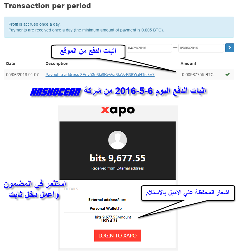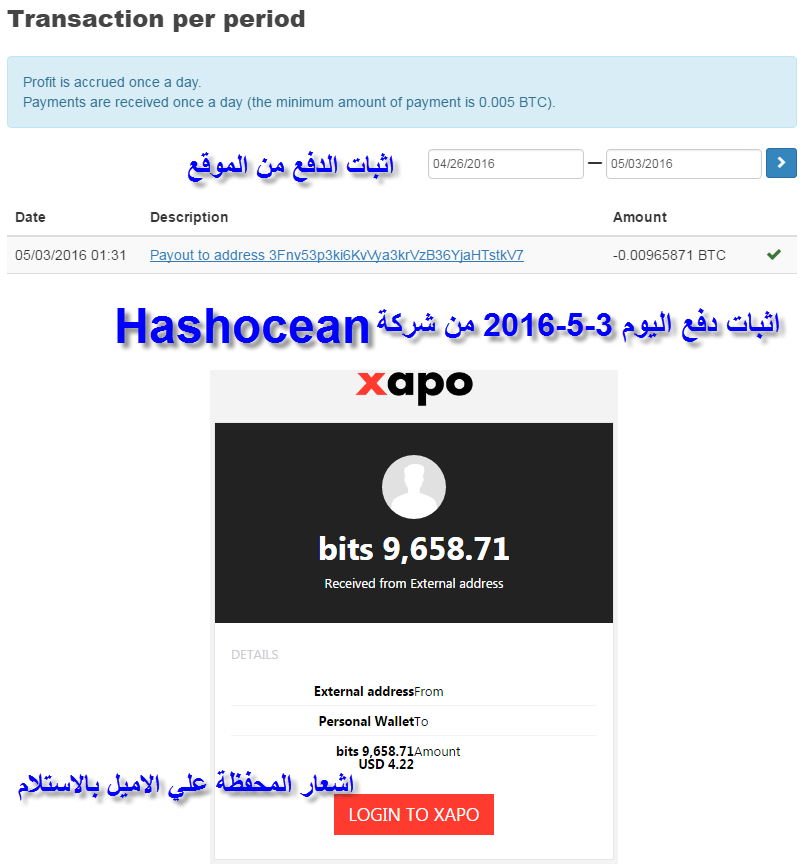 رد: افضل موقع hashocean لتعدين البيتكوين وافضل ربح مع الاثبات والشرح . . اثبات دفع من شركة hashocean بتاريخ اليوم 2016/4/27 بعد شراء KH/S 1200 بما يعادل 348$ دولار ما يقوم بأنتاج ربح يومي بهذه الطاقة = 4.05$ مدي الحياه وفي طموح بشراء المزيد من الطاقة فموقع hashocean تابع لشركة تعدين حقيقية وليس منة قلق وهو الاضمن والاصدق علي الانترنت بحسب خبرتي الاثبات من اشعار المحفظة علي الاميل http://irba7.com/upload/do.php?img=4617 بالتوفيق للجميع يا رب . . |