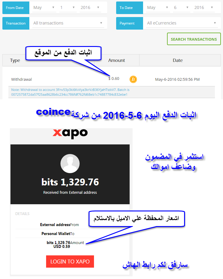 شرح افضل شركة استثمار coince للاستثمار في تعدين البيتكوين السلام عليكم ورحمة الله وبركاتة دعوني اقدم لكم الشركة الغنية عن التعريف coince من اصدق الشركات الموجوده علي الانترنت للاستثمار شركة coince لها تاريخ طويل من العمل بدون اي مشاكل منذ بدايتها عام 2008 حتي الان 2016 في الاستثمار http://irba7.com/upload/do.php?img=4648 نبذه عن شركة coince شركة coince هي شركة حقيقية مقرها بلندن قام بتأسيسها قاده رئيسيين في اسواق تجارة جملة الكهرباء شركة coince لها تاريخ طويل تأسست عام 2008/1/11 وسبب صدقها في التعامل حتي الان اصبت من الشركات الاكثر ثقة بين شركات الاستثمار المماثله عبر الانترنت ظلت تعمل شركة coince في مجال تداول الكهربا بالاسواق حتي عام 2013 عندما وجدوا ان استغلال طاقة الكهرباء في تعدين عملة البيتكون BITCOIN فهي مربحه حقا فقامو ببناء مركز بيانات خاص من المعدات الرائده في التعدين وبناء المركز علي معايير عالمة المستوي واستضافة عمال المناجم بأقل تكلفة للطاقة شركة Coince يثق بها حتي الان 558362 وهذا هو عدد المثتسمرين بالموقع في وقت كتابة هذا المقال شركة coince لها حساب علي الفيس يضم اكثر من 95219 عضو وايضا علي تويتر 37805 في وقت كتابة هذا المقال تقدم شركة coince شهادة موثقة بقيمة أسهم الاستثمار لضمان حق المستثمر الشهاده تجده كما بالصورة التاليه تقدم شركة coince شهادة موثقة بقيمة أسهم الاستثمار http://irba7.com/upload/do.php?img=4649 يوجد دعم مباشر في شركة Coince خلال 7 ايام في الاسبوع 24 ساعه في اليوم من خلال موظفين حقيقين عبر هاتف او عبر ارسال بريد علي أميل الدعم والهاتف والبريد تجدهم بالموقع شركة مسجلة رسميا منذ عام 2004 حتي 2022 ويمكنك زيارة الموقع التالي للتأكيد هنـــــــــا تتميز بحماية قوية جدا من اكثر من شركات الحماية وافضلها كيفية البدء في الاستثمار في موقع او شركة coince توفر شركة coince خطة واحدة فقط للاستثمار والعائد 2% يوميا علي اجمالي قيمة الايداع الوقت المحدد لاي وديعه 90 يوما العائد الاجمالي 180% مضمن بينهم الوديعه مثال اذا استثمرت 100$ دولار تأخذ شهادة اسهم بهذه القيمه وتبدء بتاريخ وصول الوديعه وتنتهي بعد 90 يوم من وقت وصول الوديعه الربح اليومي 2% = 2$ دولار 2×90 يوم = 180 دولار العائد يحتسب 7 ايام في اسبوعيا ليس هناك ايام عطله كالكثير من المواقع العائد يحتسب مره واحده يوميا اقل قيمة للاستثمار في coince هي 10$ دولار تقوم بأيداع المبلغ عبر البنكوك الالكترونية التي يدعمها coince البنوك الالكترونية التي يدعمها Coince في السحب والايداع يمكنك الاستثمار بعملة البيتكوين BITCOIN او الدولار من خلال البنوك بيتكوين BITCOIN - بايير payeer - بريفكت موني perfectmoney السحب يكون بنفس وسيلة الايداع مع امكانية اعادة الاستثمار من رصيدك بالموقع ولكن ليس اقل من 10$ دولار الايداع يصل خلال اقل من 12 ساعه من وقت الارسال الحد الادني للسحب 0.01$ الدفع خلال اقل من 24 ساعه من وقت طلب السحب ليس هناك اي شروط مثل اشتراك شهري او مشاهدة اعلانات كالكثير من المواقع يمكنك شراء الكثير من الشهادات وعمل اكثر من ايداع بداية من 10$ دولار لكل وديعه مدتها وارباحها منفصله شركة coince موثوقة مثل شركة hashocean اظن ليس هناك شئ لم نتكلم عنه وكل ما تبقي البدء في العمل ملحوظة لا يمكنك الربح من الريفرل الا اذا كان لك وديعة نشطة للتسجيل لانشاء حساب بموقع انقر علي coince او انقر علي البنر التالي ( الصور ) http://irba7.com/upload/do.php?img=4650 الفديو التالي هو شرح بسيط لمن يكون صعب علية التعامل الشرح تفصيلي لموقع coince بداية من التسجيل والايداع حتي السحب [youtube]pkXK9FpJQss[/youtube] رابط التسجيل في موقع coince.com للعلم الوديعة التي قمت بأيداعها بالشرح وصلت بعد ساعه فقط **** اثبات دفع السحب الاول من الشركة العملاقة coince الموجود بالفديو السابق تم الدفع بعد 90 دقيقة تقريبا من طلب السحب الاثبات بالصورة التالية سحب من شركة coince بتاريخ 5/5/2016 http://irba7.com/upload/do.php?img=4647 هنا ان شاء الله ستجد جميع اثباتات السحب متجده بأستمرار وصلنا الي آخر موضوع شركة coince للاستثمار المضمون لاي استفسار ضع ردأ وسأقوم بالرد 