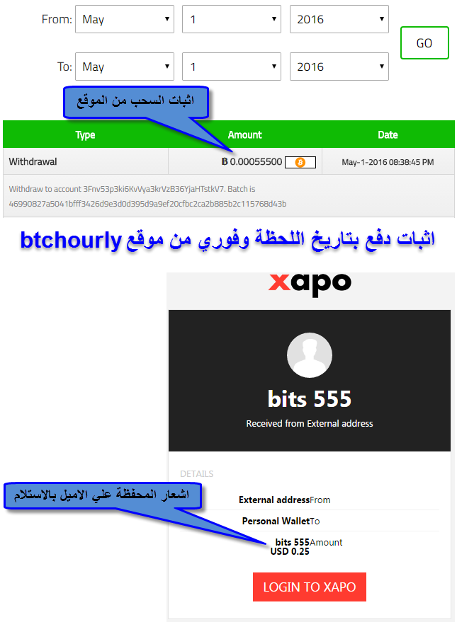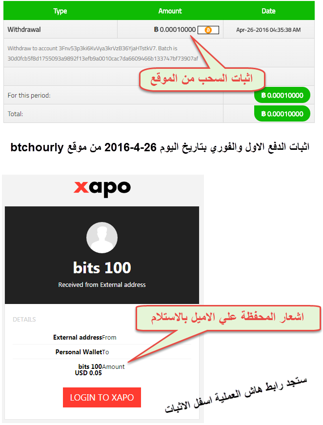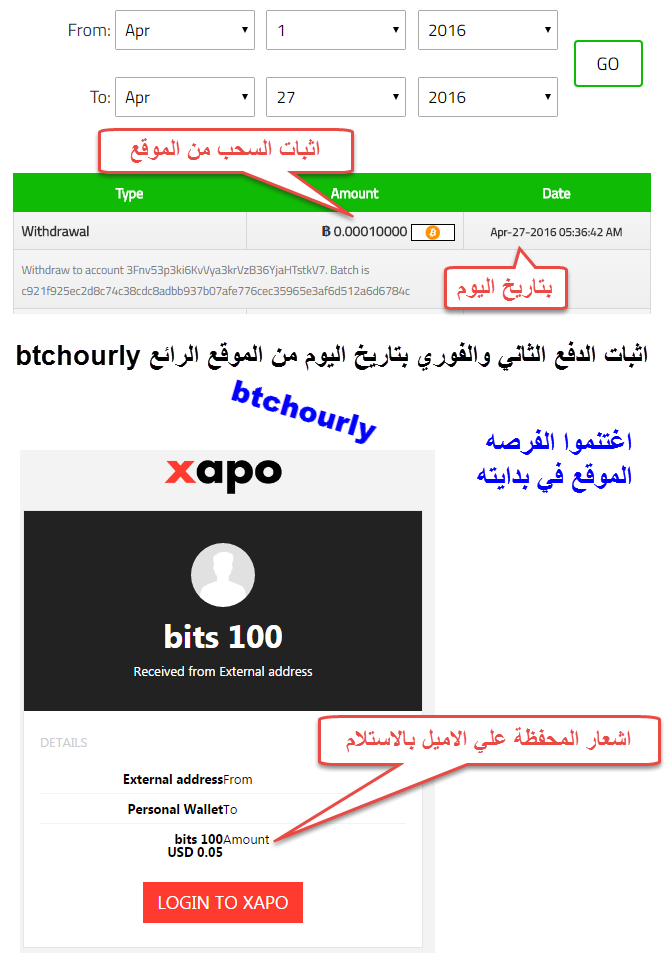 شرح موقع btchourly لاستثمار البيتكوين والربح كل ساعه مع الاثبات السلام عليكم ورحمة الله وبركاتة معنا اليوم موقع btchourly جديد لاستثمار البيتكوين bitcoin موقع btchourly رائع جدا وبمميزات جيده حقا http://irba7.com/upload/do.php?img=4614 انطلق للعمل عبر شبكة الانترنت موقع btchourly يوم 13/4/2016 بتاريخ اليوم فهو لا يعمل سوي 13 يوم ويدفع فوري يوفر موقع btchourly اكثر من ثلاث خطط للاستثمار الخطة الاولي الربح كل ساعه لها 8 مستويات المستويات محدده حسب كمية الايداع للاستثمار وايضا الربح المستوي الاول اقل كمية ايداع من 0.00100000฿ الي 1.50000000฿ بيتكوين الربح كل ساعه 20% المستوي الثاني اقل كمية ايداع من 1.50100000฿ الي 3.00000000฿ بيتكوين والربح كل ساعه 22% المستوي الثالث اقل كمية للايداع من 3.00100000฿ الي 5.00000000฿ بيتكوين والربح كل ساعه 25% المستوي الرابع اقل كمية ايداع من 5.00100000฿ الي 10.00000000฿ بيتكوين والربح كل ساعه 30% المستوي الخامس اقل كمية ايداع من 10.00100000฿ الي 25.00000000฿ بيتكوين والربح كل ساعه 40% المستوي السادس اقل كمية ايداع من 25.00100000฿ الي 50.00000000฿ بيتكوين والربح كل ساعه 50% المستوي السابع اقل كمية ايداع من 50.00100000฿ الي 100.00000000฿ بيتكوين والربح كل ساعه 60% المستوي الثامن اقل كمية ايداع من 100.00100000฿ الي 5000.00000000฿ بيتكوين والربح كل ساعه 75% والصوره التاليه توضح نفس التفاصيل http://irba7.com/upload/do.php?img=4615 وهناك خطط محدوده لكبار المستثمرين بكميات كبيره جدا بالنسبة للخطة الاولي والمستوي الاولي هو ما قمت بالعمل به كتجربه للموقع هذه الخطة تنتهي بعد 104 يوم او 2500 ساعه من وقت وصول الوديعه للموقع كل 100 الف ساتوشي = في الساعه 200 ساتوشي ربح حتي تنتهي فتره الوديعه موقع btchourly يوفر 3 طرق للايداع والسحب ومع العلم طريقة الايداع هي نفس طريقة السحب مثلا اذا قمت بأيداع بيتكوين لابد من السحب بيتكوين يدعم الايداع والسحب علي بيتكوين بريفكت موني بايير يوفر موقع btchourly ربح عمولة علي الريفرل بخمس مستويات في موقع btchourly الحد الادني للسحب 10 الاف ساتوشي موقع btchourly مسجل حتي عام 2018 للتسجيل بموقع btchourly اضغط هنــــــــا او اضغط علي البنر التالي ( الصوره ) http://irba7.com/upload/do.php?img=4613 وقمت بعمل شرح لطريقة التسجيل والايداع والسحب ايضا ولكني لم اصل للحد الادني للسحب وان شاء الله الاثبات تجده هنا بأستمرار فتابع الشرح بالفديو التالي [youtube]rKFDPerVQ-I[/youtube] تم الوصول للحد الادني بعد 25 ساعه بالضبط وتم السحب حالا والدفع فوري في لحظة اثبات السحب الاول والفوري بالصوره التالية اثبات دفع موقع btchourly بتاريخ 26/4/2016 http://irba7.com/upload/do.php?img=4612 رابط هاش عملية السحب علي blockchain https://blockchain.info/tx/30d0fcb5f...33747bf73907af رابط التسجيل في موقع btchourly هنـــــــــــــــــــا مع تمنياتي للجميع بالربح الوفير |