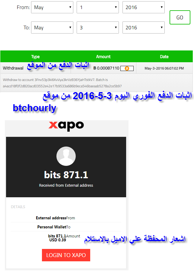رد: شرح موقع btchourly لاستثمار البيتكوين والربح كل ساعه مع الاثبات . . . سحب اليوم الفوري بتاريخ 2016/5/1 من موقع btchourly الاثبات بالصوره التاليه http://irba7.com/upload/do.php?img=4639 تحذير بخصوصو الايداع بالبيتكوين الموقع لا تظهر بة ودائع البيتكوين وهناك مشكلة لم يتم حلها بعد اما السحب فوري ولكن جميع وسائل الايداع الاخرة تعمل وفوري السحب والايداع رابط هاش عملية سحب البيتكون للتأكد https://blockchain.info/tx/46990827a...5b2c115768d43b بالتوفيق للجميع . . |