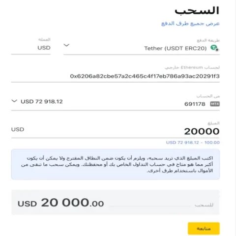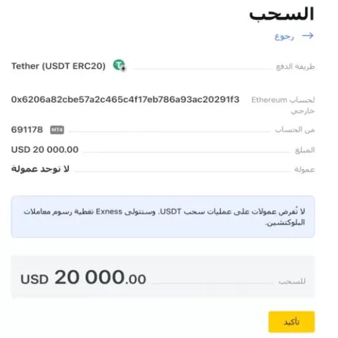السحب من شركة exness بعملة usdt تيثر Tether (USDT ERC20) السحب من شركة exness بعملة USDT يتم في ثواني حتي يصل مبلغ السحب الي حسابك في محفظتك بعملة Tether (USDT ERC20) من اشهر واضمن العملات الرقمية التي تستخدم في الإيداع والسحب في شركة اكسنس. كيفية السحب من شركة exness بعملة Tether (USDT ERC20) https://irba7.com/upload/do.php?img=5367 سابقا قدمنا شرح بالفيديو عن كيفية السحب من exness على Binance Pay ، كذلك السحب من شركة exness بعملة usdt تيثر ERC 20. أيضاً قدمنا كيفية السحب من exness إلى Perfect Money و السحب من exness إلى بنك skrill و أخيراً السحب من exness إلى Neteller . أولاً قم بتسجيل الدخول إلى المساحة الشخصية في شركة اكسنس ، ثم قم بالضغط على كلمة السحب من القائمة الجانبية. ثانياً قم بالضغط على أيقونة عملة Tether (USDT ERC20) من خيارات السحب وهذه هي أيقونة العملة في صفحة خيارات السحب. https://irba7.com/upload/do.php?img=5366 ثالثاً قم باختيار الحساب الذي ترغب سحب الأموال منه كذلك اكتب المبلغ مع مراعاة أن الحد الأدنى هو 100 دولار والحد الأقصى هو مليون دولار في المعاملة الواحدة. https://irba7.com/upload/do.php?img=5368 بعد ذلك تنتقل إلى صفحة مراجعة عملية السحب وبعد المراجعة قم بالنقر علي ايقونة تأكيد كما هو موضح في الصورة التالية. https://irba7.com/upload/do.php?img=5369 عندها يتم إرسال رمز التحقق إلى الهاتف أو البريد الالكتروني ، وذلك حسب نوع الحماية التي اخترتها عند فتح الحساب. أخيراً أكتب رمز الامان في صفحة السحب ثم قم بالنقر على تأكيد. بعد ذلك تكون المعاملة قيد المعالجة وفي خلال دقائق يصلك المبلغ الى حسابك في محفظة USDT ERC20 الخاصة بك. فتح حساب اسلامي مع شركة EXNESS قناة الموقع على اليوتيوب https://youtube.com/@ForexArabOnline قناة الموقع على Tiktok https://www.tiktok.com/@forexarabonline فيديو عن السحب من شركة exness بعملة usdt تيثر Tether (USDT ERC20) https://www.youtube.com/watch?v=htst813kN5o&t=21s |