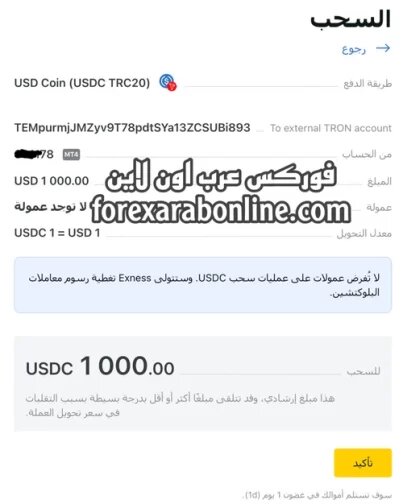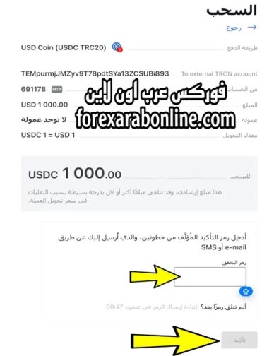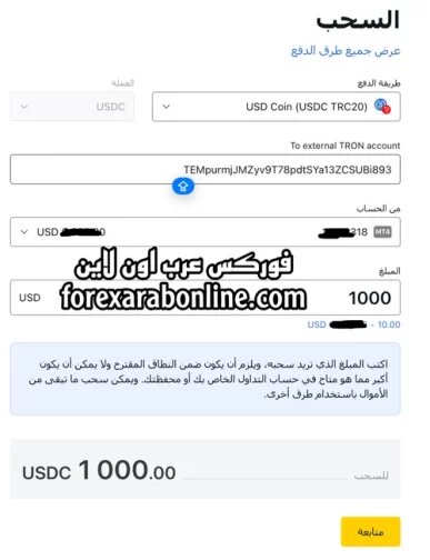 السحب من exness بعملة USDC TRC20 طريقة السحب من exness بعملة USDC TRC20 تتم في أقل من دقيقة إلى أن يصل مبلغ السحب الي حسابك في محفظتك. عملة USD Coin من العملات المشهورة بين العملات الرقمية التي تستخدم في السحب والإيداع مع شركة اكسنس قبل كل شيء ستجد في هذا القسم كل ما تريد معرفته عن شركة اكسنس شرح بالفيديو والصور لكل سؤال يخطر علي بالك. كذلك ستجد هنا كيفية فتح حساب تداول إسلامي والتحقق من الحساب كاملا في شركة exness. سابقا قدمنا شرح بالفيديو عن كيفية السحب من exness باستخدام محافظ العملات الرقمية. على سبيل المثال محفظة Binance Pay ، كذلك محفظة usdt تيثر ERC 20، أيضاً محفظة تيثر USDT (TRC20) أيضاً قدمنا كيفية السحب من اكسنس علي البنوك الالكترونية مثل السحب علي Perfect Money كذلك السحب إلى بنك skrill و أخيراً السحب إلى Neteller . السحب من exness بعملة USDC TRC20 أولاً قم بتسجيل الدخول إلى المساحة الشخصية في شركة اكسنس ، ثم قم بالضغط على كلمة السحب من القائمة الجانبية. ثانياً اختار أيقونة عملة عملة USDC TRC20 من خيارات السحب وهذه هي أيقونة العملة في صفحة خيارات السحب. كما هو موضح في الصورة التالية. https://irba7.com/upload/do.php?img=5388 ثالثاً قم باختيار الحساب الذي ترغب سحب الأموال منه كذلك اكتب المبلغ مع مراعاة أن الحد الأدنى هو 10 دولار والحد الأقصى هو مليون دولار في المعاملة الواحدة. بعد ذلك اكتب رقم المحفظة والمبلغ ثم قم بالضغط على أيقونة متابعة كما هو موضح في الصورة التالية. https://irba7.com/upload/do.php?img=5389 بعد ذلك تنتقل إلى صفحة مراجعة عملية السحب وبعد المراجعة قم بالنقر علي ايقونة تأكيد كما هو موضح في الصورة التالية. https://irba7.com/upload/do.php?img=5390 عندها يتم إرسال رمز التحقق إلى البريد الالكتروني أو الهاتف الجوال ، وذلك حسب نوع الحماية التي قمت بتعينها عند فتح الحساب. أخيراً أكتب رمز الامان في صفحة السحب ثم قم بالنقر على تأكيد كما هو موضح في الصوة التالية . https://irba7.com/upload/do.php?img=5391 بعد ذلك تكون المعاملة قيد المعالجة وفي خلال دقائق يصلك المبلغ الى حسابك في محفظة USDC TRC20 الخاصة بك. كما هو موضح في الصورة التالية https://irba7.com/upload/do.php?img=5392 فتح حساب اسلامي مع شركة EXNESS قناة الموقع على YouTube قناة الموقع على TikTok |