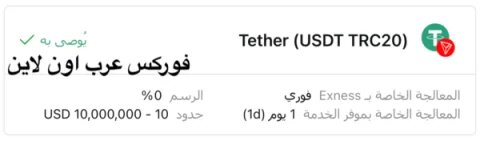 كيفية الإيداع في exness بعملة usdt تيثر شرح بالفيديو كيفية الإيداع في exness بعملة usdt تيثر إلى حساب التداول في شركة اكسنس من محفظة عملة Tether (USDT TRC20) الخاصة بك في BINANCE أو المحافظ الأخري شرح بالفيديو والصور. وهي عملة من أشهر وأوثق العملات الرقمية التي تستخدم في الإيداع والسحب مع exness كذلك يستخدمها المتداولون على نطاق واسع في معاملاتهم المالية. قبل كل شيء ستجد في هذا القسم كل ما تريد معرفته عن شركة اكسنس شرح بالفيديو والصور لكل سؤال يخطر علي بالك. كذلك ستجد هنا كيفية فتح حساب تداول إسلامي والتحقق من الحساب كاملا في شركة exness. كيفية الإيداع في exness بعملة usdt https://irba7.com/upload/do.php?img=5497 سابقاً قدمنا بالفيديو شرح طريقة السحب من exness بعملة usdt تيثر وتمت المعاملة في ثواني ولكن في هذه المقالة نقدم بالشرح المصور كيفية الإيداع في exness بعملة usdt. أولاً قم بتسجيل الدخول إلى مساحتك الشخصية في شركة اكسنس ، بعد ذلك قم بالنقر على كلمة الإيداع من القائمة الجانبية. ثم قم بالضغط على أيقونة عملة Tether (USDT TRC20) من خيارات الإيداع وهذه هي أيقونة عملة usdt المقصودة في الصورة التالية. https://irba7.com/upload/do.php?img=5498 ثانياً قم باختيار الحساب الذي ترغب في إيداع الأموال فيه ثم اضغط علي ايقونة متابعة. مع مراعاة أن الحد الأدنى هو 10 دولار والحد الأقصى هو مليون دولار في العملية الواحدة كما هو موضح في الصورة التالية. https://irba7.com/upload/do.php?img=5499 أخيراً تنتقل الى صفحة نسخ عنوان محفظة شركة exness كما هو موضح في الصورة التالية. https://irba7.com/upload/do.php?img=5500 قم بنسخ عنوان المحفظة او مسح كيو آر كود ثم توجه الى محفظتك في BINANCE أو المحافظ الأخري و وضع عنوان محفظة اكسنس وقم بالتحويل. بذلك تمت المعاملة وفي خلال ثواني يصلك المبلغ الى حساب التداول في exness الخاصة بك. فتح حساب اسلامي مع شركة EXNESS قناة الموقع على YouTube |