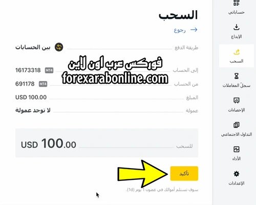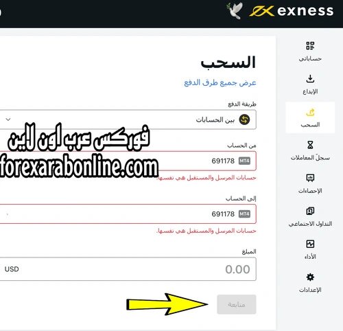 التحويل بين الحسابات في شركه exness شرح بالفيديو التحويل بين الحسابات في شركة exness يتم في ثواني معدودة. ونقصد هنا التحويل بين حساباتك التي تمتلكها في المساحة الشخصية في شركة اكسنس التي تعد واحدة من أفضل شركات الفوركس. قبل كل شيء، ستجد هنا كيفية فتح حساب تداول إسلامي والتحقق من الحساب كاملا في شركة exness. بالإضافة إلى ذلك ستجد في هذا القسم كل ما تريد معرفته عن شركة اكسنس شرح بالفيديو والصور لكل سؤال يخطر علي بالك. كيفية التحويل بين الحسابات في شركة exness https://irba7.com/upload/do.php?img=5502 قم بتسجيل الدخول إلى مساحتك الشخصية في شركة exness بعد ذلك اضغط علي ايقونة السحب كما هو موضح في الصورة التالية. https://irba7.com/upload/do.php?img=5503 بعد ذلك اضغط علي ايقونة بين الحسابات من وسائل السحب المتعددة التي توفرها شركة اكسنس للمتداولين كما هو موضح في الصورة التالية. https://irba7.com/upload/do.php?img=5504 قم باختيار الحساب الذي سوف يتحول منه إلى حسابك الآخر الذي سوف تحول إليه. ثم اكتب المبلغ الذي تريد تحويله وبعد ذلك اضغط علي ايقونة متابعة كما هو موضح في الصورة التالية. https://irba7.com/upload/do.php?img=5505 تنقلك شركة exness إلى صفحة المراجعة وفيها الحساب المحول منه كذلك الحساب المحول اليه واخيرا المبلغ الذي سوف يتم تحويله. إذا كنت تريد تغير اي شي اضغط على رجوع أعلى الصفحة. اما اذا كنت راضً عن المعاملة قم بالضغط على ايقونة تأكيد كما هو موضح في الصورة التالية. https://irba7.com/upload/do.php?img=5506 بعد ذلك يتم تحويل الأموال إلى الحساب المراد التحويل اليه دون الحاجة إلى رمز الأمان الذي يرسل الي البريد الالكتروني او الهاتف الجوال. https://irba7.com/upload/do.php?img=5507 ذلك لأن التحويل يتم داخل المساحة الشخصية لنفس المتداول وليس خارج المساحة الشخصية للمتداول ، وستجد أن المعاملة تمت وهي قيد المراجعة في ثواني كما هو موضح في الصورة التالية. فتح حساب اسلامي مع شركة EXNESS قناة الموقع على YouTube فيديو عن التحويل بين الحسابات في exness شرح بالفيديو https://www.youtube.com/watch?v=Hb_ID1BIL1o |