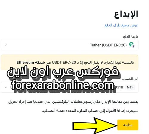 الايداع في exness بعملة usdt erc20 شرح بالفيديو شرح بالصور والفيديو كيفية الايداع في exness بعملة usdt erc20 بطريقة مبسطة والمبلغ يصل إلى حسابك في شركة exness في ثواني. عملة usdt erc20 من أشهر العملات الرقمية التي تستخدم في الإيداع والسحب مع شركة exness كذلك يستخدمها المتداولون على نطاق واسع في المعاملات المالية. قبل كل شيء ستجد في هذا القسم كل ما تريد معرفته عن شركة اكسنس شرح بالفيديو والصور لكل سؤال يخطر علي بالك. طريقة الايداع في exness بعملة usdt erc20 https://irba7.com/upload/do.php?img=5646 سابقاً قدمنا بالفيديو شرح طريقة السحب من exness بعملة usdt تيثر وتمت المعاملة في ثواني. ولكن في هذه المقالة نقدم بالشرح المصور والفيديو الإيداع بإستخدام usdt erc20. الخطوة الأولى قم بتسجيل الدخول إلى مساحتك الشخصية في شركة اكسنس سواء من جهاز الكمبيوتر أو من الهاتف المحمول. بعد ذلك قم بالنقر على أيقونة الإيداع من القائمة الجانبية. ثم قم بالضغط على أيقونة عملة usdt erc20 من خيارات الإيداع المتعددة وهذه هي أيقونة العملة المقصودة في الصورة التالية. https://irba7.com/upload/do.php?img=5647 الخطوة الثانية قم باختيار الحساب الذي تريد إيداع الأموال فيه ثم اضغط علي ايقونة متابعة. مع مراعاة أن الحد الأدنى في الإيداع هو 10 دولار والحد الأقصى هو مليون دولار في العملية الواحدة كما هو موضح في الصورة التالية. https://irba7.com/upload/do.php?img=5648 الخطوة الأخيرة تنتقل الى صفحة نسخ عنوان محفظة شركة exness سواء عن طريق مسح رمز الإستجابة QRCode أو نسخ الادرس الخاصة بشركة اكسنس كما هو موضح في الصورة التالية. https://irba7.com/upload/do.php?img=5649 قم بنسخ عنوان المحفظة او مسح كيو آر كود ثم توجه الى محفظتك في BINANCE أو المحافظ الأخري و وضع عنوان محفظة اكسنس وقم بالتحويل. بذلك تمت المعاملة وفي خلال ثواني يصلك المبلغ الى حساب التداول في exness الخاصة بك. فتح حساب اسلامي مع شركة EXNESS قناة الموقع على https://www.youtube.com/@ForexArabOnlineYouTube قناة الموقع على TikTok الفيديو متاح علي اليوتيوب |