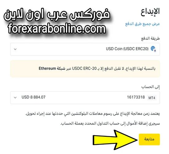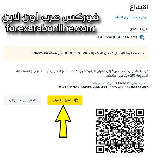 الإيداع في exness بعملة USDC erc20 شرح بالفيديو شرح بالصور والفيديو طريقة الإيداع في exness بعملة USDC erc20 على شبكة ايثريوم في دقيقة والمبلغ يصل إلى حسابك في شركة exness فوراً. عملة USDC erc20 من العملات الرقمية التي تستخدم في الإيداع والسحب مع شركة exness كذلك يستخدمها المتداولون على نطاق واسع في المعاملات المالية. قبل كل شيء ستجد في هذا القسم كل ما تريد معرفته عن شركة اكسنس شرح بالفيديو والصور لكل سؤال يخطر علي بالك. طريقة الايداع في exness بعملة USDC erc20 https://irba7.com/upload/do.php?img=6254 عليك الإنتباه لأن هذه الطريقة تدعم عناوين USDC erc20 وأى خطأ لا يمكن التراجع فيه ويتسبب في فقدان مبلغ الإيداع. سابقاً قدمنا بالفيديو شرح طريقة السحب من exness بعملة usdt تيثر وتمت المعاملة في ثواني. ولكن في هذه المقالة نقدم بالشرح المصور والفيديو الإيداع بإستخدام usdt erc20. الخطوة الأولى قم بتسجيل الدخول إلى مساحتك الشخصية في شركة اكسنس سواء من جهاز الكمبيوتر أو من الهاتف المحمول. بعد ذلك قم بالنقر على أيقونة الإيداع من القائمة الجانبية. ثم قم بالضغط على أيقونة عملة USDC erc20 من خيارات الإيداع المتعددة وهذه هي أيقونة العملة المقصودة في الصورة التالية. https://irba7.com/upload/do.php?img=6255 الخطوة الثانية قم باختيار الحساب الذي تريد إيداع الأموال فيه ثم اضغط علي ايقونة متابعة. مع مراعاة أن الحد الأدنى في الإيداع هو 10 دولار والحد الأقصى هو 10 مليون دولار في العملية الواحدة كما هو موضح في الصورة التالية. https://irba7.com/upload/do.php?img=6256 الخطوة الأخيرة تنتقل الى صفحة نسخ عنوان محفظة شركة exness سواء عن طريق مسح رمز الإستجابة QRCode أو نسخ الادرس الخاصة بشركة اكسنس كما هو موضح في الصورة التالية. https://irba7.com/upload/do.php?img=6257 م بنسخ عنوان المحفظة او مسح كيو آر كود ثم توجه الى محفظتك في BINANCE أو المحافظ الأخري و وضع عنوان محفظة اكسنس وقم بالتحويل. بذلك تمت المعاملة وفي خلال ثواني يصلك المبلغ الى حساب التداول في exness الخاصة بك. فتح حساب اسلامي مع شركة EXNESS قناة الموقع على YouTube قناة الموقع على TikTok |
